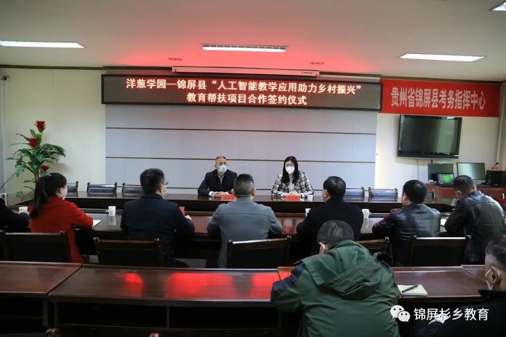 在中国农业发展银行驻锦屏帮扶三人小组组长、锦屏县县委副书记姜新春同志的引荐下,2023年1月11日上午,北京洋葱学园光合新知(北京)科技有限公司项目总监崔英子到锦屏县就“人工智能教学应用助力乡村振兴”帮扶项目进行合作洽谈,并召开了项目洽谈会。会上,北京洋葱学园光合新知(北京)科技有限公司详细介绍了项目的基本情况,表明合作旨在通过使用教研教学智能解决方案(含洋葱学园教学平台、学习资源、线上教学培训课程),开展面向锦屏县教师人工智能教学应用,促进教师专业发展和智能教育素养提升,帮扶贫困地区教师专业发展能力全面提升,助力乡村振兴。洋葱学园光合新知(北京)科技有限公司承诺将在三年内免费捐赠、支持智能教学平台,智能教学资源,教学服务等教学应用功能系统。