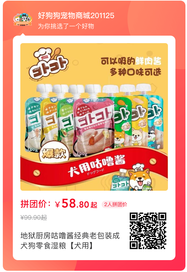 各位铲屎注意啦:火爆零食放大漏!!!10包/单,拼团价58.8元!!仅有100单哦,因为保质期到22年8月所以放个漏(原价70+),介意勿拍哦,受yqx影响到地区不能立即发货可以等待呢~ 识别下方二维码秒杀哦👇
